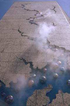 The River Sculpture is a celebration of water, the universal source of life. In a site-specific development, the wall of the Grove Hotel is transformed into a vertical river cut into the granite skin of the building. Neon, fog, fused glass, and a light reactive background are incorporated, visually transforming from day to night. The dynamic interplay of water and light is projected out from the two dimensional plane of the riverbed into three dimensions, creating an effect of looking into reflective water. Research revealed the existence of a network of canals beneath the city streets, and the Boise City Canal beneath the new hotel. This work acknowledges the existence of this water by releasing it so that it appears to burst out of the ground and reclaim the wall. The river imagery grows directly out of the importance and connection of the life and inhabitants of the City to the river. Location: